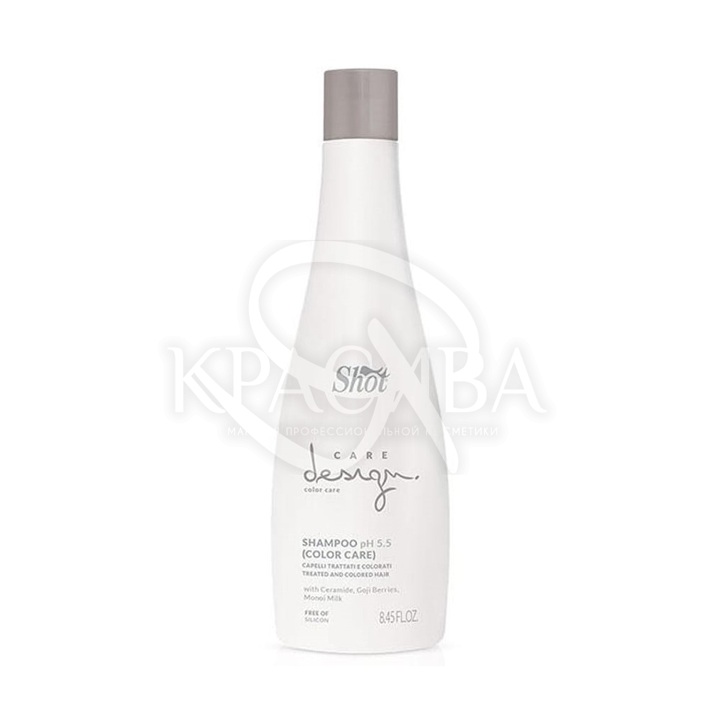 Гігієнічний продукт має натуральні інгредієнти, які сприяють не лише очищенню, а й зміцненню структури волосся. До складу Shot Care Design Color Care Treated And Colored Hair Shampoo входять кераміди, олія моної та екстракт з ягід годжі. Ці речовини допомагають захистити забарвлені пасма від зовнішніх факторів та вимивання, а також зберегти насиченість відтінку. Засіб відновлює волосся зсередини і надає їм привабливого вигляду.