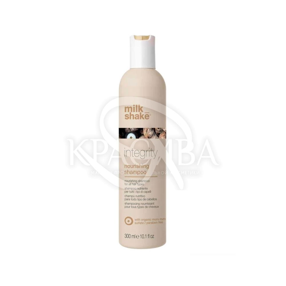 Опис: Поживний шампунь з формулою без парабенів та сульфатів м'яко очищає волосся і містить органічну олію муру-муру, яка допомагає зберегти колір волосся. milk_shake integrity живильний шампунь миттєво живить, кондиціонує і зволожує, усуваючи пухнастість, роблячи волосся м'яким і сяючим.