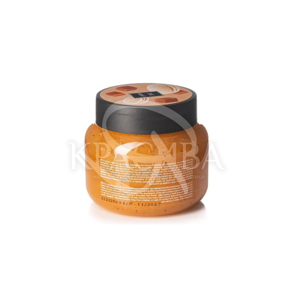 Опис: Скраб для тіла з ароматом вершкової карамелі очищує та відновлює шкіру, бореться із целюлітом. Екстракт червоного перцю посилює кровообіг, сприяючи формуванню стрункого силуету. Капсаїцин у складі скрабу сприяє зменшенню ознак "апельсинової шкірки", робить шкіру більш гладкою та твердою.