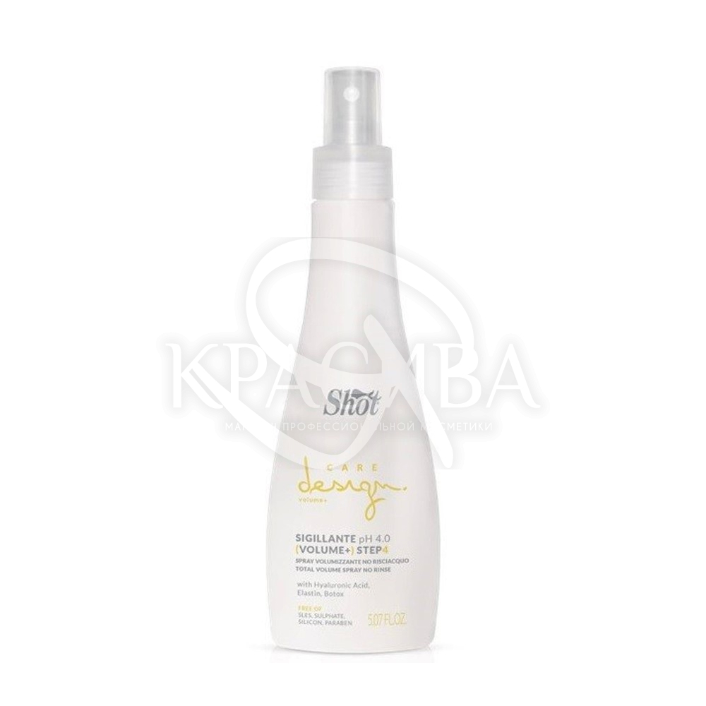 Опис: Засіб є четвертим етапом у комплексному догляді за тонкими та пошкодженими пасмами. Care Design Volume+ Step 4 Total Volume Spray No Rinse надає локонам прикореневий об'єм, відновлює структуру пошкоджених ділянок та ущільнює тонкі пористі волоски. У його складі міститься гіалуронова кислота, ботокс, еластин та необхідні мінеральні солі, які зволожують та наповнюють стрижні пасм, збільшуючи їх діаметр. Спрей можна використовувати як самостійний продукт для щоденного догляду.