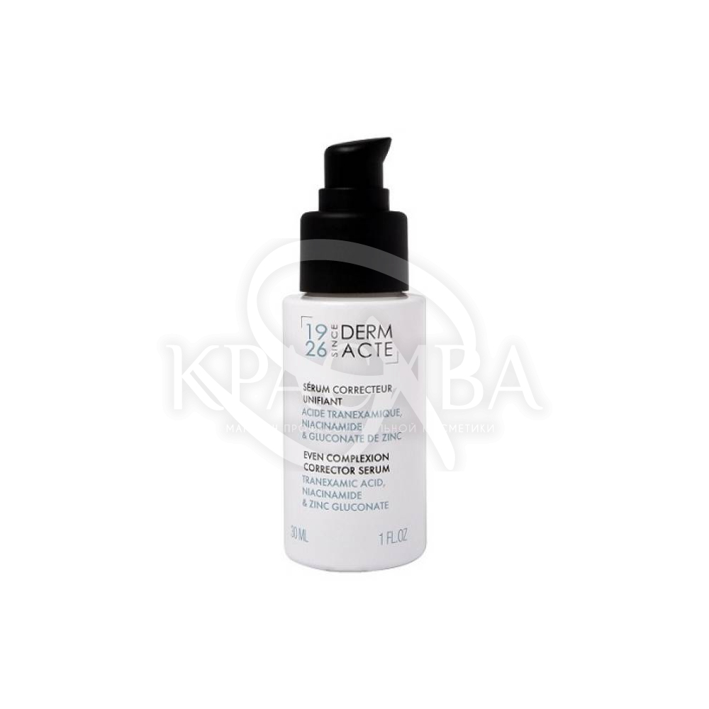 Опис: Освітлююча коригуюча сиворотка Derm Acte Even Complexion Corrector Serum допомагає зробити шкіру безперечною на вигляд і на ощупь. Зменшує прояв пігментних плям (їх розмір, інтенсивність), сужає пори, надає тривалу матуючу дію і захищає шкіру від щоденного агресивного впливу навколишнього середовища.