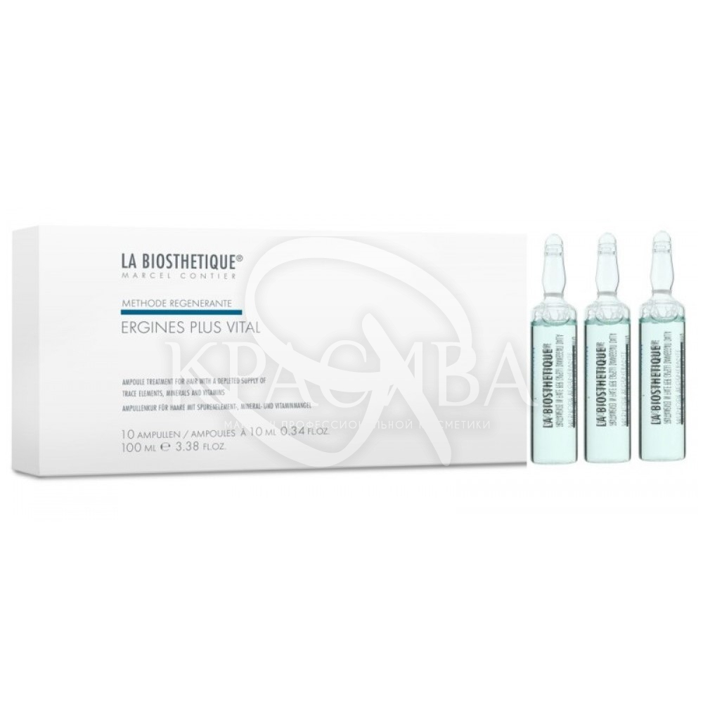 Опис: Ergines Plus Vital є ідеальним стимулятором для тонких, ламких і позбавлених сили волосся. Курс ампул забезпечує волоссю необхідну кількість мікроелементів, мінералів і вітамінів.