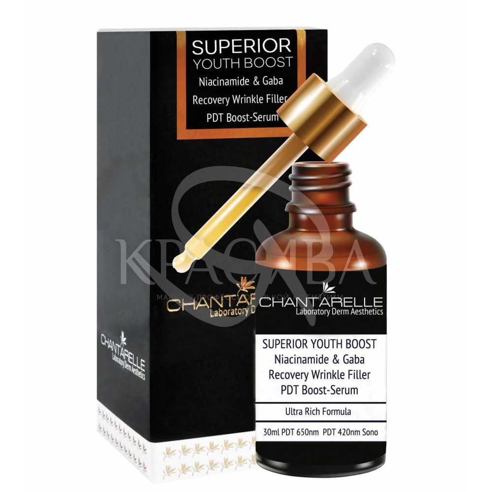 PDT Boost-Serum з ніацинамідом та кислотою ГАМК відновлює захисний бар'єр шкіри та стимулює вироблення колагену. Миттєво і надовго зменшує зморшки та глибокі борозенки. Він зменшує TEWL – трансепідермальну втрату води через епідерміс, тим самим підвищуючи гідратацію та еластичність шкіри, розгладжуючи та роблячи шкіру ідеально м'якою.