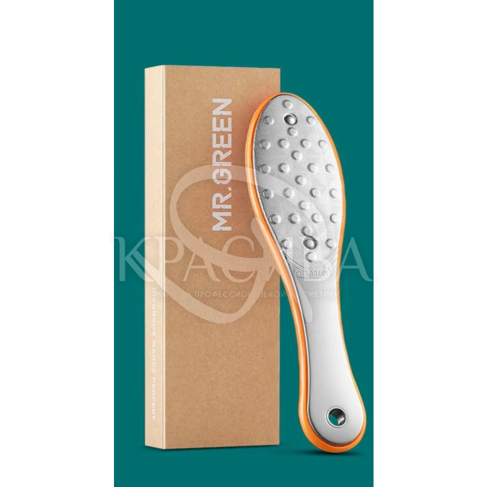 Опис: Двостороння терка для ніг MR GREEN з ручкою. Використовується при сухій та вологій обробці стоп. Ефективно видаляє висохлу та грубу шкіру з п'ят і пальців ніг, грубі мозолі та натоптиші. Шкіра стопи стає гладкою, м'якою та еластичною. Якісний та надійний інструмент, який допоможе професійно доглядати за шкірою стоп у домашніх умовах. Сучасний дизайн пилки та якісна упаковка є чудовим подарунком.