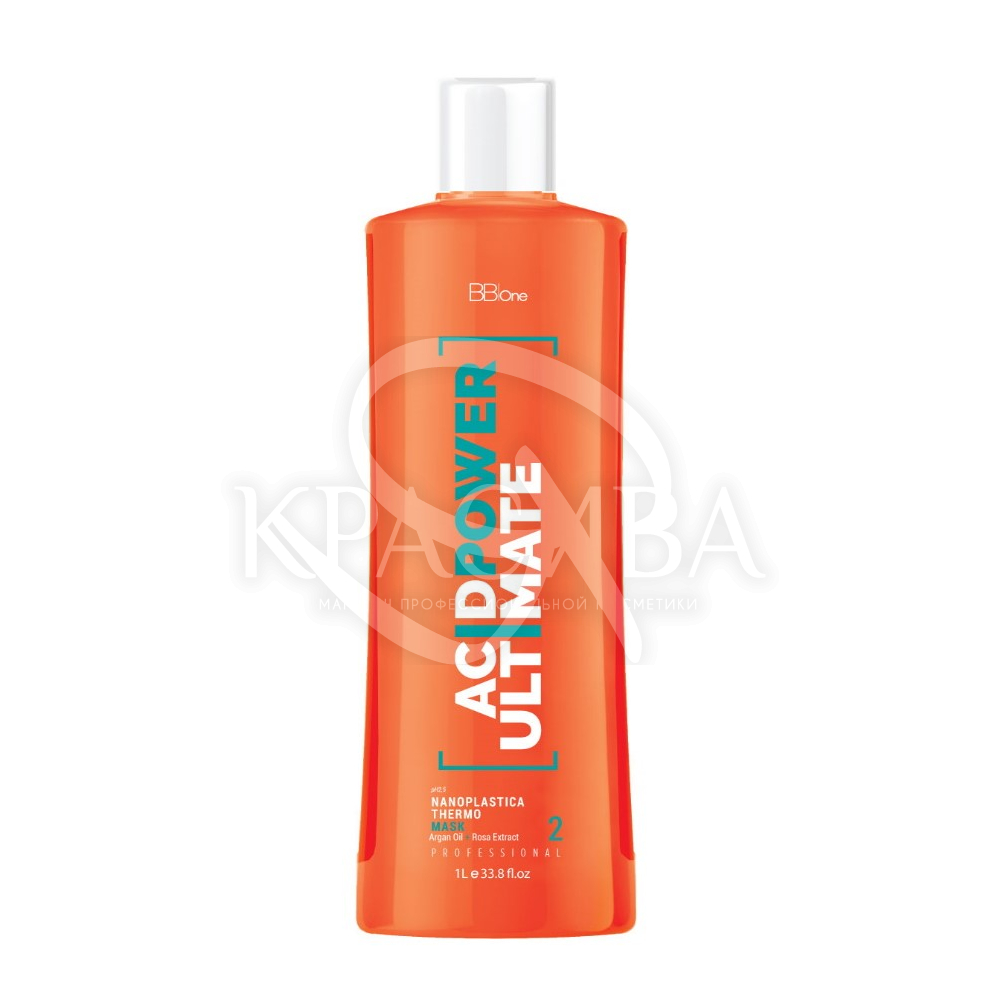 Опис: Формула нанопластики Acid Power Ultimate Thermo Mask крок 2 pH 2,5 містить потужний комплекс натуральних кислот і амінокислот, що дозволяє 100% випрямити волосся будь-якої складності, pH. Має приємний аромат свіжості, і підходить для роботи з підлітками та жінками в положенні. Може застосовуватися на освітленому та мелірованому волоссі середнього та низького ступеня пошкодження. Склад максимально комфортний, безпечний та ефективний, надає волоссю дзеркальної гладкості та блиску.