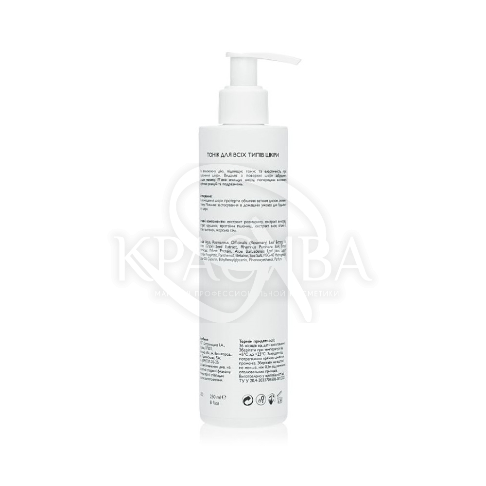 Тонік для очищення всіх типів шкіри для віку 18+ підходить юній шкірі, догляд якої має ряд нюансів. Засіб допомагає захистити її від пересушування, а також від надмірного вироблення шкірного жиру, нормалізує кислотно-лужний баланс. У комбінації з косметикою, що доглядає, розчин з корисними активними речовинами надає шкірі доглянутий, свіжий вигляд. Придбати Тонік для очищення всіх типів шкіри для віку 18+ варто регулярно, тому що він дбайливо завершує етап очищення. З його допомогою можна усунути відчуття стягнутості, яке виникає після вмивання через лужне середовище.Тоніки для обличчя виробництво Україна — це гармонійне поєднання ефективності та натурального складу, створене з урахуванням потреб різних типів шкіри. Він м'яко очищає шкіру від залишків макіяжу та забруднень, відновлює водний баланс та готує обличчя до нанесення засобів основного догляду. Тонік часто містить екстракти ромашки, календули, алое віра та інших рослинних компонентів, завдяки яким шкіра стає більш м'якою, свіжою та доглянутою. Регулярне застосування тоніка сприяє підтримці здорового зовнішнього вигляду та покращенню текстури шкіри.