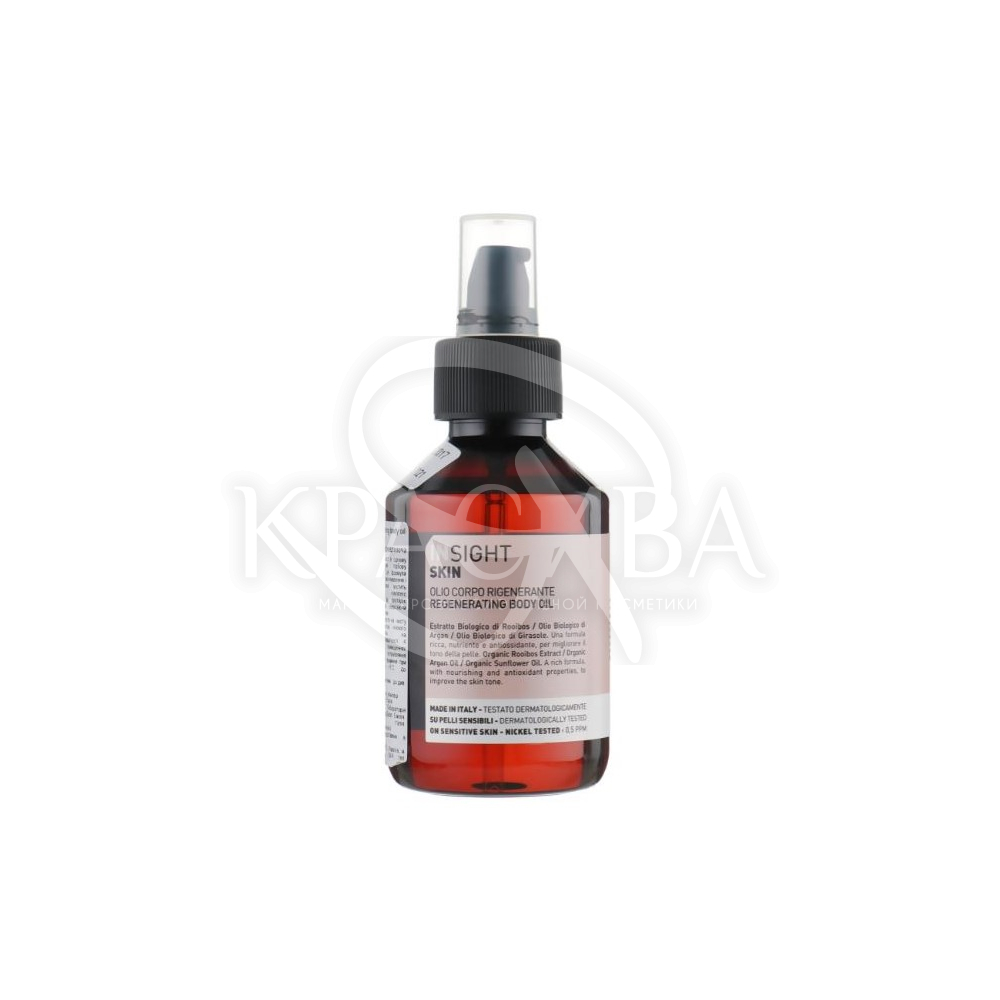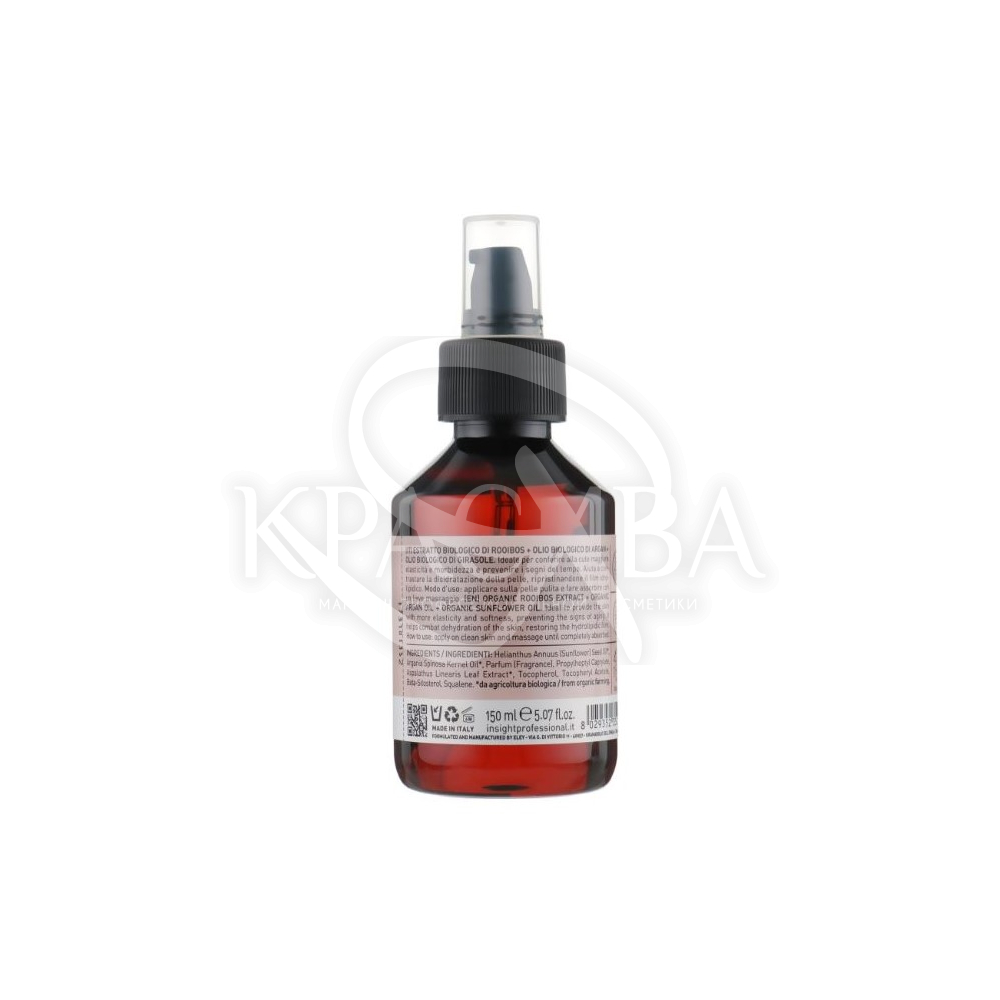Опис: Продукція італійського бренду Insight - це високоякісні косметичні засоби, створені на основі органічних інгредієнтів. Для зволоження шкіри тіла та зміцнення її захисних функцій, живлення та уповільнення процесів старіння експертами бренду створено регенеруючу олію Insight Skin Regenerating Body Oil. У його формулі поєднуються дві найбільш цінні органічні рослинні олії — аргани і соняшник, і екстракт ройбосу.