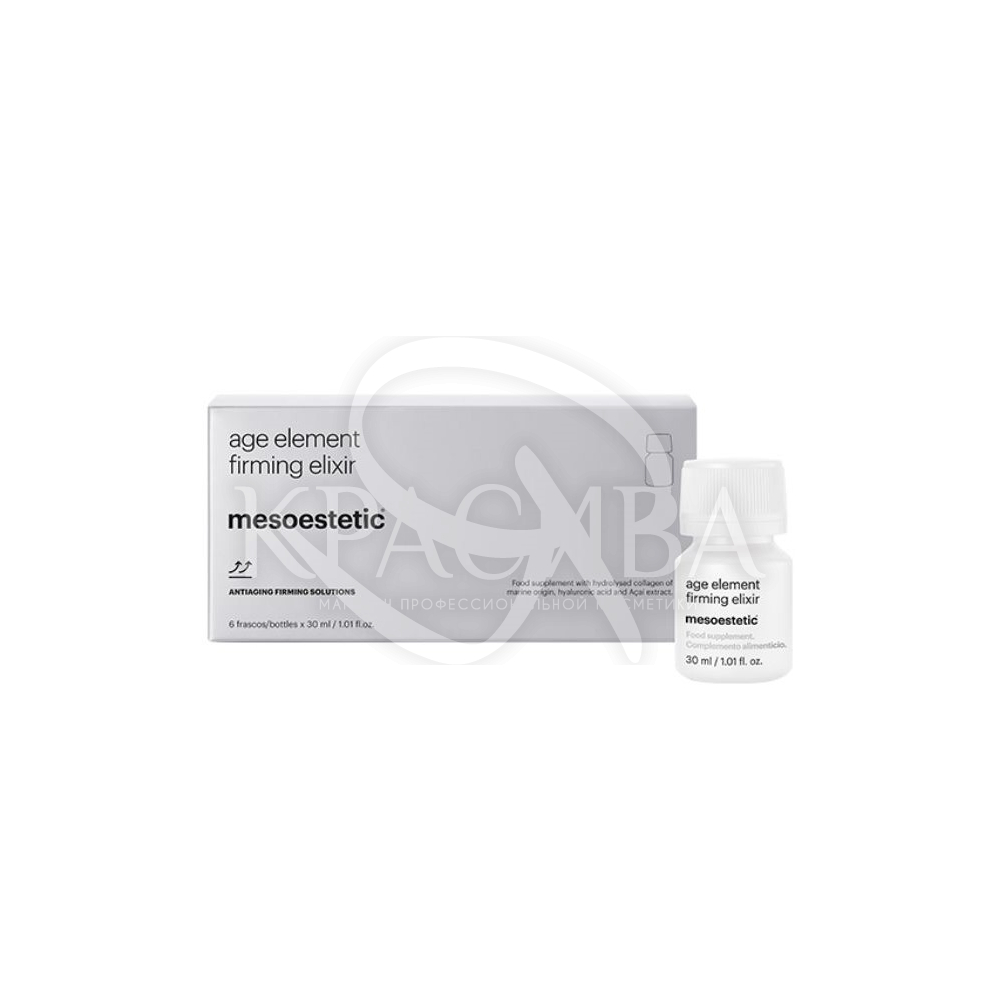 Мезоэстетический укрепляющий эликсир Age Element, не содержащий сахара и содержащий всего четыре калории на бутылку, представляет собой питьевую добавку, которая способствует выработке эндогенного коллагена и защищает его от разрушения. Каждый эликсир со вкусом мандарина и ежевики обладает укрепляющим действием и содержит 10 г высококачественного морского гидролизованного коллагена, гиалуроновой кислоты и активных ингредиентов, включая экстракт ликопина и экстракт асаи, которые помогают уменьшить окислительное повреждение.