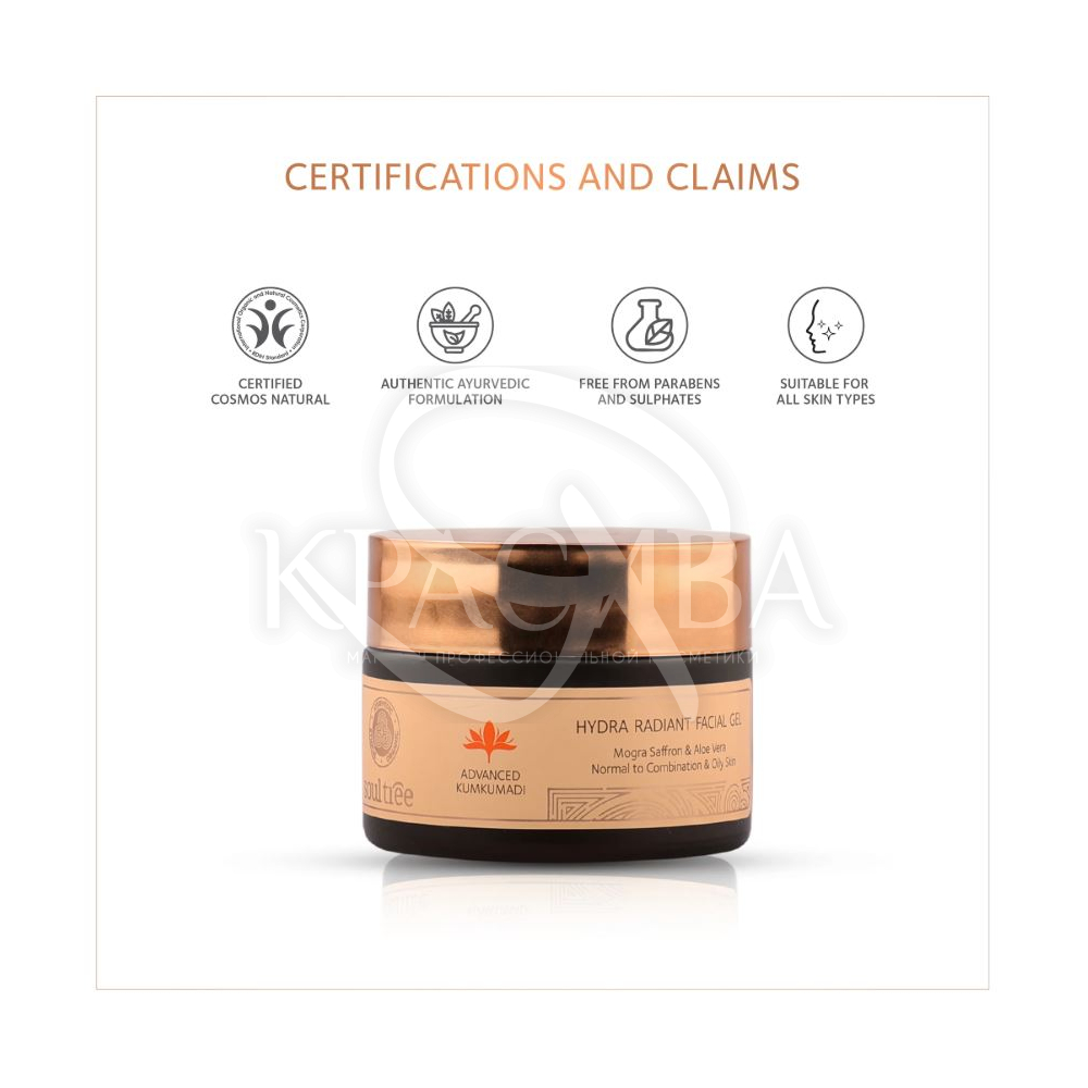 Состав: Гриткумари (алоэ вера) — 0,75 г Могра (жасмин) — 0,45 г Кесарь (шафран) — 0,45 г Масло кумкум — 0,25 г Манджиштха — 0,06 г Яштимадху (сладкая) — 0,06 г Состав (INCI): Вода (Aqua), глицерин (Glycerin), ксантановая камедь (Xanthan Gum), натрий PCA (Sodium PCA), натрий глюконат (Sodium Gluconate), натрий лактат (Sodium Lactate), этил оливат (Ethylе склероцию (Sclerotium Gum), парфюм/ароматизатор (Parfum), коко-каприлат/каприт (Coco-Caprylate/Caprate), изоамил лаурат (Isoamyl Laurate), бензиловый спирт (Benzyl Alcohol)(и) глицерил лаурат (и) глицерил лаурат (и) (алоэ вера) (Aloe Barbadensis (Aloe Vera) Juice), вода жасмина лекарственного (Jasminum Officinale (Jasmine) Water), гидрозоль посевного шафрана (Crocus sativus (Saffron) Hydrosol), масло Crocus sativus (кумкум) (Krocus sativ стеарат(и) глицерил стеарат(и) стеариловый спирт (Polyglyceryl-2 Stearate (and) Glyceryl Stearate (and) Stearyl Alcohol), нити/рыльца шафрана (Crocus sativus (Strands)), Rubia cordifolia (манджиштха), Glycyr (сандаловое дерево), Symplocos racemosa (лодхра). Аллергены ароматизатора (из эфирных масел): бензил бензоат, бензил ацетат, фарнезол, гераниол, лимонен, линалоол.