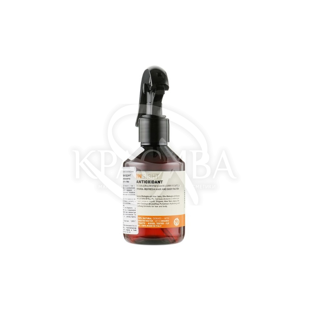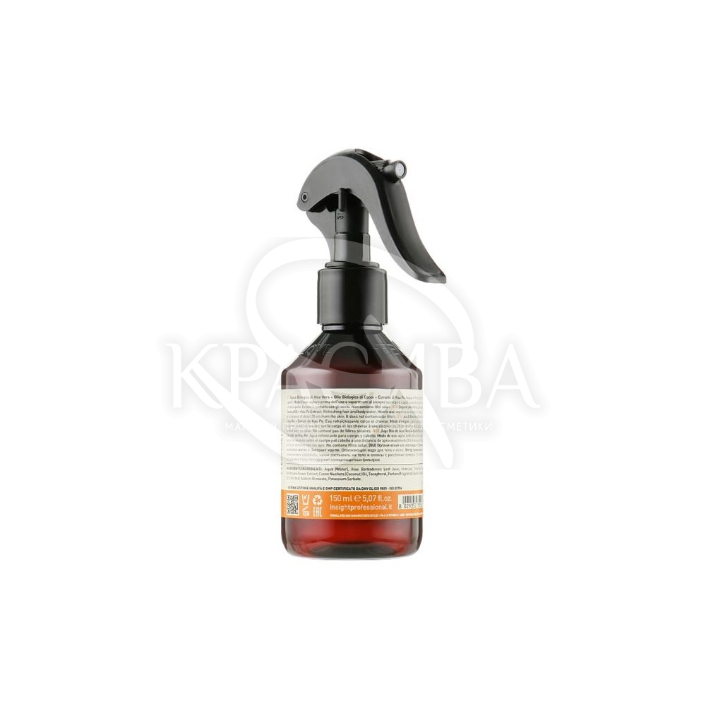 Описание: Принятие душа было бы хорошим вариантом, но не всегда есть возможность сделать это в эту же минуту. Гидро-освежающая вода для волос и тела от Insight – решение, которое не только подарит комфорт, но и позаботится о состоянии кожи и локонов. Средство во флаконе с удобным распылителем, образующим облако, обогащено самым ценным комплексом масел и экстрактов, которые смягчают, увлажняют, питают и восстанавливают. Вода обладает приятным ароматом.