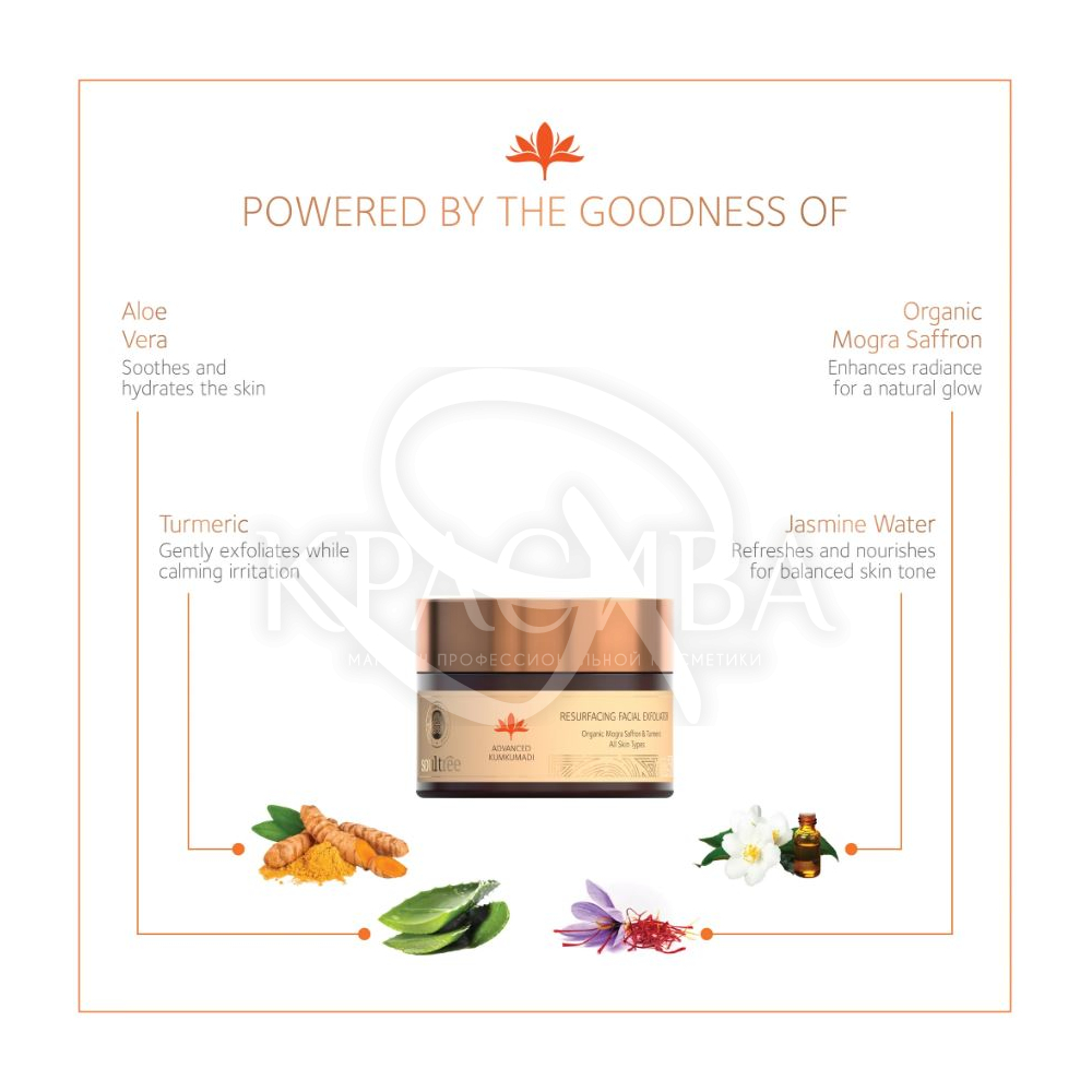 Описание: Восстанавливающее отшелушивающее средство Advanced Kumkumadi со 100% органическим шафраном Mogra, куркумой, алоэ вера и жасминовой водой деликатно очищает и обновляет кожу. Формула глубоко очищает поры, регулирует выделение себума и помогает уменьшить пигментацию и следы загара, оставляя кожу чистой, сияющей, мягкой и упругой.