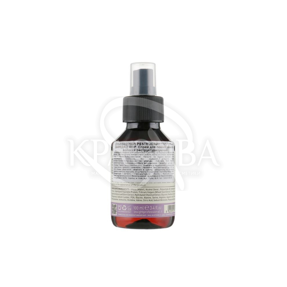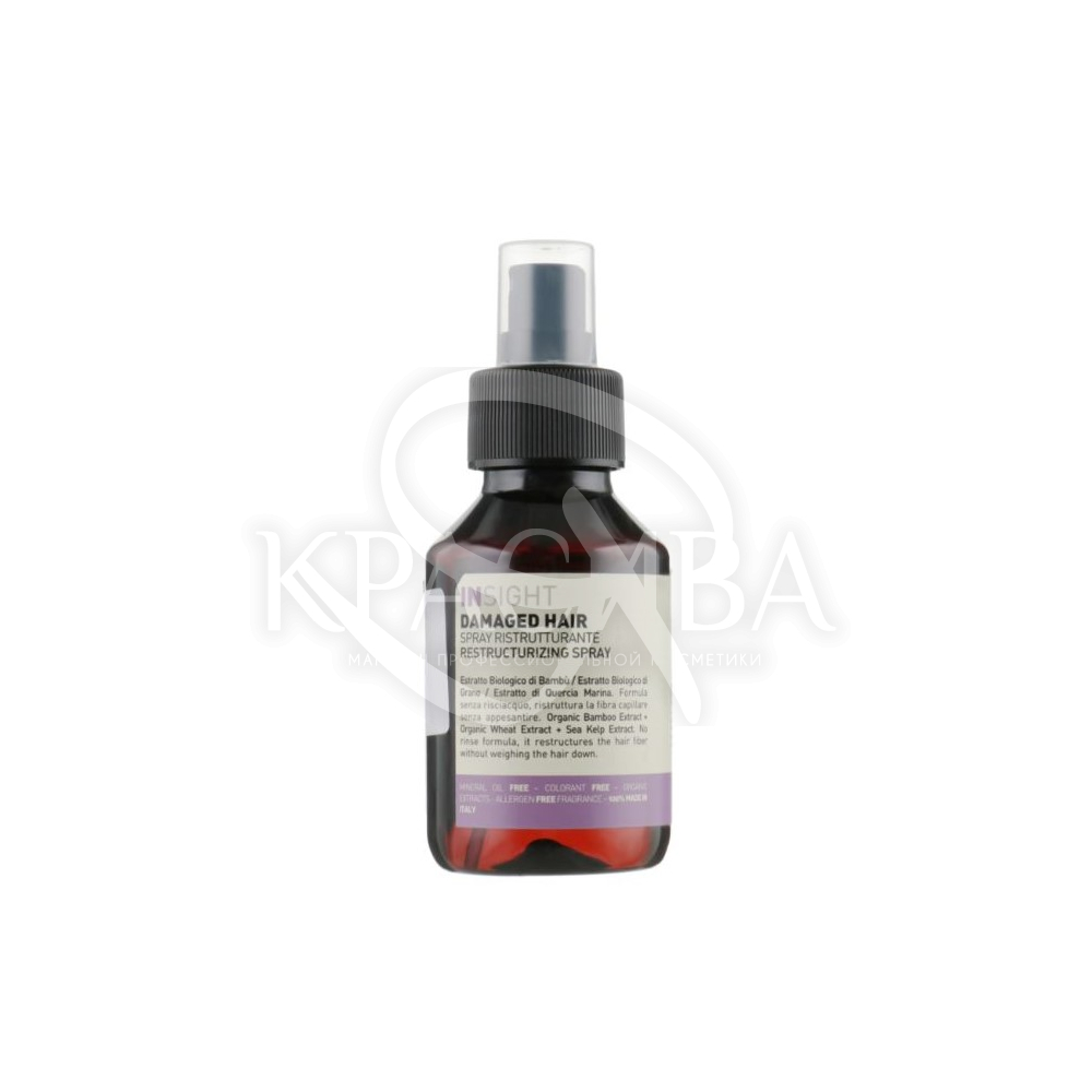 Продукт станет замечательным дополнением комплексного ухода за прядями. В составе восстанавливающего спрея Insight Damaged Hair Restructurizing Spray присутствуют экстракты пшеницы, морских водорослей и бамбука. Благодаря этому он оказывает смягчающее действие, восполняет нехватку естественного кератина, разглаживает и способствует удержанию влаги в стержнях волос. Продукт пригодится для заботы о волосах, ослабленных частыми горячими укладками или отсутствием систематического полноценного ухода.